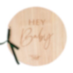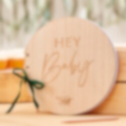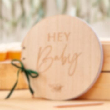 Rund gjestebok i tre med tilhørende grønn rosett og med motiv av teksten "Hey Baby". Gjesteboken består av 32 blanke blad og er ca. 21 x 22 cm stor. Boken kan med fordel brukes både til dåp og babyshower.