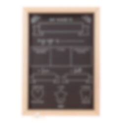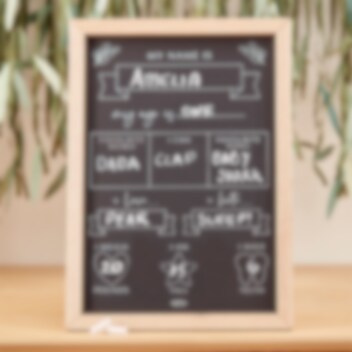 Svart milestonetavle med babymotiv fra kolleksjonen Botanical Baby. Her kan foreldrene fylle inn de ulike sakene om barnet sitt. Tavlen er ca. 42 cm høy og ca. 30 cm bred og er økovennlig. Pakken inkluderer også 3 stk. hvite kritt.
