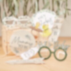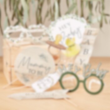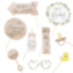 10 stk. photoprops i vakre farger med ulike babyrelaterte motiver. Du og gjestene dine kan bruke disse for å ta morsomme bilder under babyshoweren.