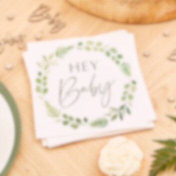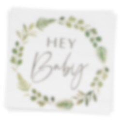 16 stk. miljøvennlige servietter i hvit og grønt med motiv av teksten "Hey Baby". Fine å ha med på festbordet når det er dåp eller babyshower. Serviettene er 2-lags og er ca. 33 x 33 cm store utfoldet.