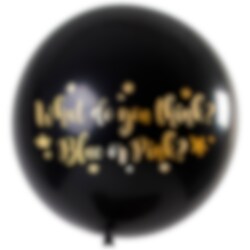 Stor svart ballong med motiv av teksten “What do you think? Blue or Pink?” i gullfarge, som inneholder blå konfetti. En stilig dekorasjon som man med hjelp av en nål kan sprekke på gender reveal-festen for å avsløre barnets kjønn. Ballongen blir ca. 90 cm i diameter oppblåst, og kan blåses opp med luft eller helium