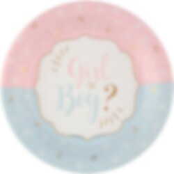 10 stk. fine papptallerkener i blå og rosa med teksten "Girl or Boy?" og med andre fancy detaljer i gullfolie. Perfekt dekorasjon når det er tid for et gender reveal-party. Tallerkenene er ca. 22,5 cm store.