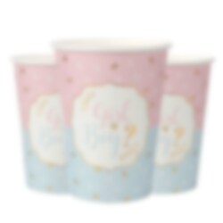 10 stk. fine pappkopper i blå og rosa med teksten "Girl og Boy?" og andre fancy gullfoliedetaljer. Søt å ha når det er tid for et gender reveal-party. Passer fint sammen med våre andre produkter fra samme tema. Koppene er ca. 9,7 cm høye og rommer 270 ml.