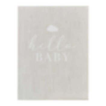 Veldig fin innbundet journalbok med linstoff og teksten "Hello Baby" i hvitt foran.