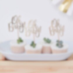 12 stk. eksklusive partypicks med motiver av teksten Oh Baby! i gullfolie. Picksen er ca 12 cm høye og motiven er ca 7 x 6 cm store.