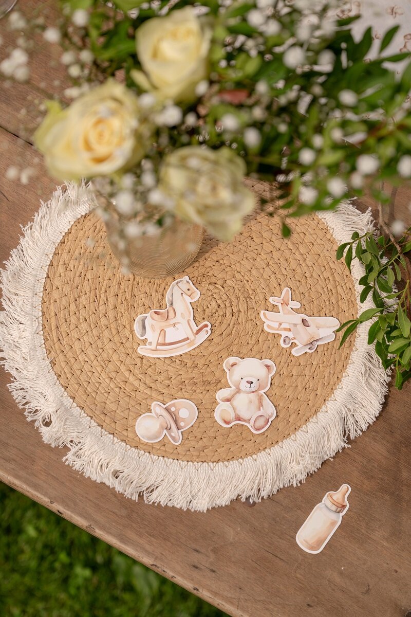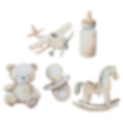 Dekorativ konfetti fra Little Teddy-serien som passer fint til babyshower, dåp og andre feiringer for den lille. De ulike motivene med bamse, smokk, gyngehest, tåteflaske og fly blir en fin detalj på det dekkede bordet og bidrar til å skape en gjennomtenkt helhet.
