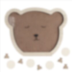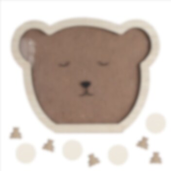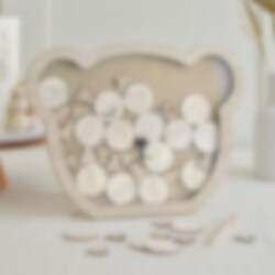 Gjesteboken har en treramme formet som et teddybjørn ansikt hvor gjestene kan legge i tremerker som lykkeønskninger. Ramen er 28 cm høy, 36,5 cm bred og 1,5 cm dyp. Den kommer med 18 runde tremerker og 20 bjørneformede tremerker, perfekte for å skrive hilsener på.