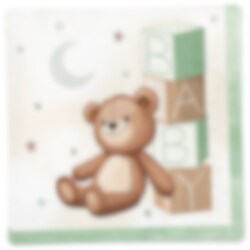 16 stk. servietter med motiver av en søt teddybjørn. Fin å dekke bordet med på babyshoweren. Serviettene har 2 lag og er 33 x 33 cm utfoldet.