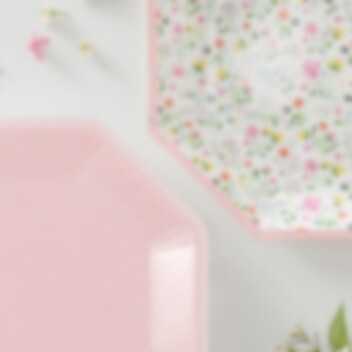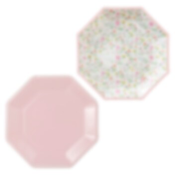 8 stk. papptallerkener i 2 ulike former. Fire av tallerkenene er i lyserosa farge, mens fire av tallerkenene har blomstermotiv. Tallerkenene er ca. 23 cm i diameter.