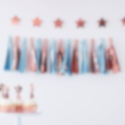 Elegant girlande med mange dusker i lyseblått og roségull. En vakker dekorasjon å ha med til Babyshoweren. Girlanden har totalt 16 stk. dusker og er ca. 1,5 meter lang.