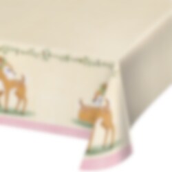 Fin bordduk laget av papir med motiv av små, søte rådyr og trekvister. Et dekorativt tilbehør til festen med temaet Deer Little One. Bordduken er ca. 137 x 259 cm stor.