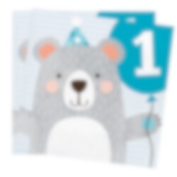16 stk. servietter i fargene grå, hvit og blå. Serviettene har motiv av en bursdagsbjørn som holder i en blå ballong med sifferet 1 på. Serviettene er 2-lags og er ca. 33 x 33 cm store utfoldet.