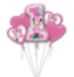 Søt ballongbukett i Minnie Mus tema. En nydelig dekorasjon til 1-årsbursdagen din. Pakken inneholder en supershape ballong (48 x 71 cm) og 4 stk. hjerteformede ballonger (43 cm)