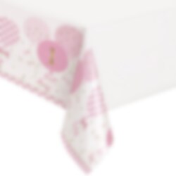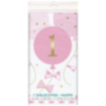 Bordduk av plast med en hvit bakgrunn og motiv av rosa ballonger, rosetter og tallet 1 i gull. Et fint tilbehør å ha med på bordet til 1-årsfesten. Duken er ca. 137 x 213 cm stor.
