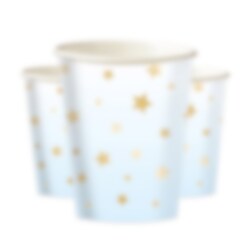 8 stk. pappkopper i blå med motiver av gullfolierte stjerner. Et flott tilbehør til når man skal dekke opp til en 1-årsfest. Koppene er ca. 10 cm høye og rommer ca. 250 ml.