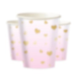 8 stk. pappkopper i en lyserosa farge med motiver av gullfolierte hjerter. Et flott tilbehør til når man skal dekke opp til en 1-årsfest. Koppene er ca. 10 cm høye og rommer ca. 250 ml.