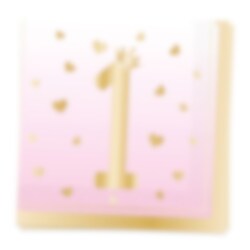 16 stk. servietter i rosa ombré med gullfargede kanter og med motiver av tallet ett med en krone på toppen, i tillegg til hjerter rundt omkring i gull. Passer perfekt når man skal dekke opp til et 1-årsfest. Serviettene er 2-lags og er ca. 33 x 33 cm store når de er brettet ut.