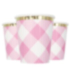 8 stk. pappkopper i et rosa- og hvitrutete mønster samt med gullfolierte kanter. Et fint tilbehør til festen. Koppene er ca. 10 cm høye og rommer ca. 270 ml.