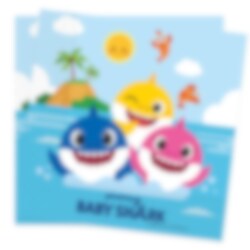 20 stk. servietter i blå nyanser med innslag av grønt, samt med motiv av babyhaien fra barnesangen Baby Shark. Fine å dekorere festbordet med. Serviettene er 2-lags og er ca. 33 x 33 cm store.