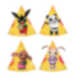 8 stk. festhatter med et søtt motiv av de ulike karakterene fra serien Bing. Hattene er ca 16 cm høye og holdes på plass med et strikk.