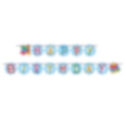 Fargerik girlander av papir med teksten "Happy Birthday" og morsomme byggkloss-motiver. Girlanderen er 2,95 meter lang og bokstavene er ca 15 cm høye. Den er fin som dekorasjon til en LEGO inspirert bursdag.