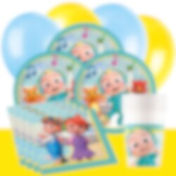Denne komplette festpakke i Cocomelon-tema med originaltilbehør inkluderer tallerkener (23 cm), pappkopper (200 ml) og servietter (33 x 33 cm) til 8 eller 16 personer. Utover dette inneholder pakken også 10 stk. gule og 10 stk. lyseblå ballonger og en gul plastduk (137 x 274 cm).