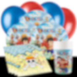 Denne komplette festpakke med One Piece originaltilbehør inkluderer tallerkener (23 cm), pappkopper (250 ml) og servietter (33 x 33 cm) for 8 eller 16 personer. I tillegg medfølger 10 stk. røde ballonger og 10 stk. mørkeblå ballonger og en svart plastduk (137 x 274 cm).