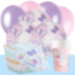 Denne komplette festpakken med med søtt tilbehør i sommerfugltema inkluderer tallerkener (23 cm), pappkopper (250 ml) og servietter (33 x 33 cm) til 8 eller 16 personer. Utover dette inneholder pakken også 10 stk. rosa og 10 stk. lyselilla ballonger og en lyseblå plastduk (137 x 274 cm).