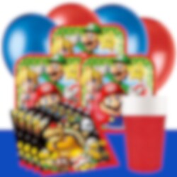 Denne komplette festpakke med Super Mario inkluderer tallerkener (18 cm), røde pappkopper (266 ml) og servietter (33 x 33 cm) for 8, 16 eller 24 personer. I tillegg medfølger 10 stk. mørkeblå og 10 stk. røde ballonger og en mørkeblå plastduk (137 x 274 cm). Pakken for 24 gjester inkluderer 2 stk. duker.