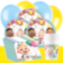 Denne komplette festpakke i Cocomelon-tema med originaltilbehør inkluderer tallerkener (23 cm), pappkopper (200 ml) og servietter (33 x 33 cm) til 8 eller 16 personer. Utover dette inneholder pakken også 10 stk. gule og 10 stk. lyseblå ballonger og en gul plastduk (137 x 274 cm).