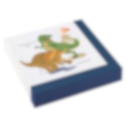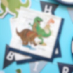 20 stk. pene servietter med hvit bakgrunn, blå kanter og tøft motiv av dinosaurer. Serviettene er i to lag og er ca. 30 x 30 cm store.