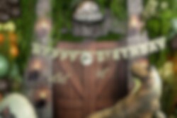Som en ekstra spennende detalj henger tre flygende dinosaurer, Pteranodoner, under girlanden og bidrar til den dynamiske dekorasjonen. Den er laget av papir og måler 45 x 165 cm.