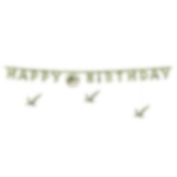 Girlanden er prydet med bokstaver som danner teksten "HAPPY BIRTHDAY" i en markant grønn nyanse med teksturert mønster. Mellom ordene henger den ikoniske Jurassic World-logoen med silhuetten av en T-Rex.