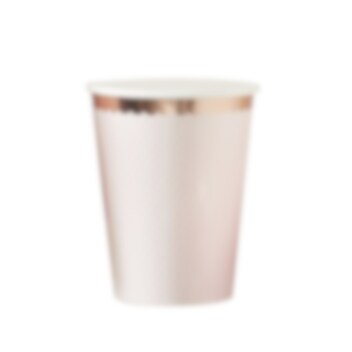 8 stk. vare pappkopper i lyserosa farge med roségullfolierte kanter. Koppene er ca. 10 cm høye og rommer ca. 270 ml.