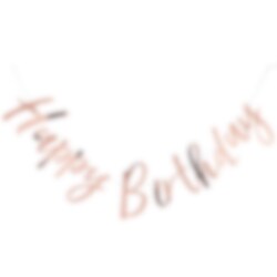 Vakker rosegullbelagt girland med teksten Happy Birthday. Heng den på veggen når det er på tid for bursdag. Girlanden er laget av papir og er ca 150 cm lang.