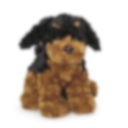 Søt kosedyrhund med myk og krøllete pels i sort og brun farge. Hunden er 25 cm høy og kan vaskes på 40 grader. Godkjent og CE-merket i henhold til EN71.