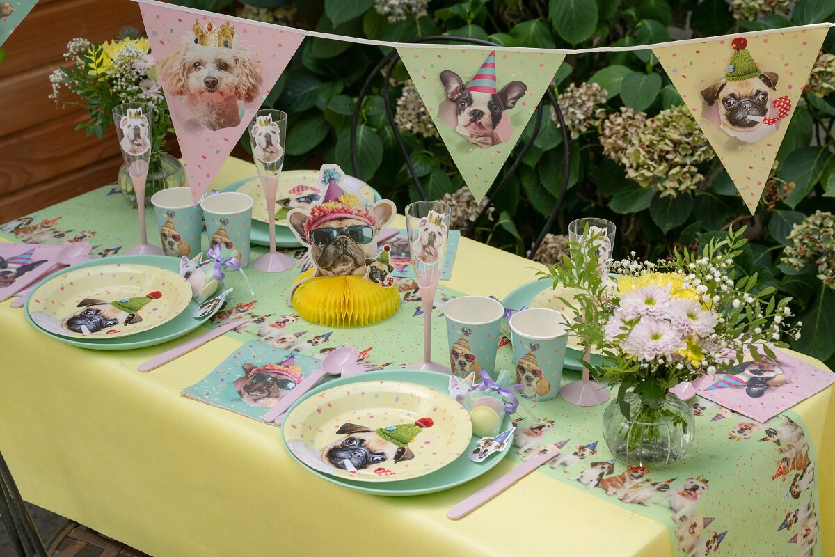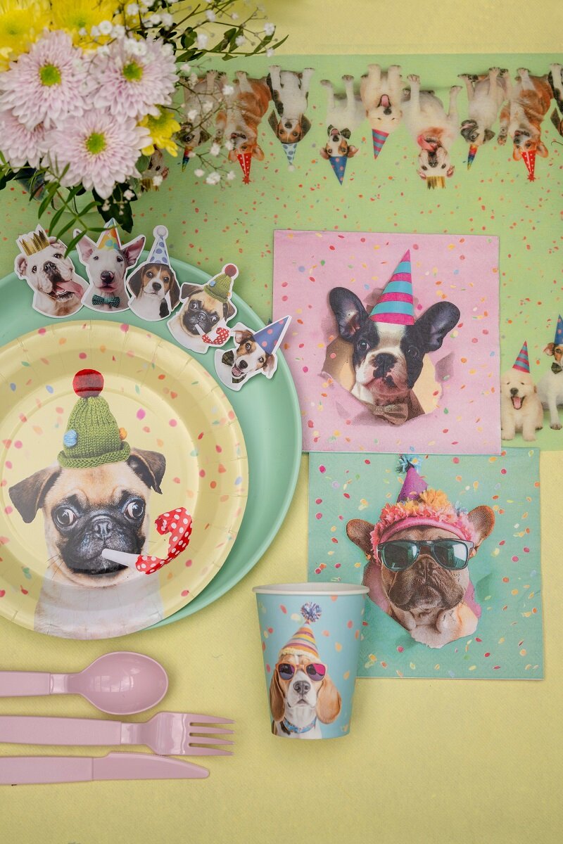 Morsomme pappkopper med et festlig hundemotiv som passer perfekt til bursdagsfest og andre feiringer med fargerik borddekking. Hunden med solbriller og festhatt gir koppene et lekent uttrykk, mens konfettimønsteret i bakgrunnen forsterker følelsen av fest.