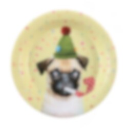 Morsomme papptallerkener med et festlig hundemotiv som passer perfekt til bursdagsfest, fest og andre feiringer der borddekkingen kan gjerne skille seg ut. Hunden med festhatt og festfløyte gir tallerkenene et lekent uttrykk, mens konfettimønsteret i bakgrunnen forsterker følelsen av fest.
