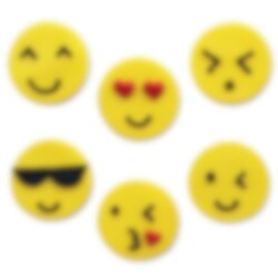 6 stk. sukkerdekorasjoner forestillende kjempefine Emoji motiver. Pynt kaken eller dine cupcakes med disse når det er bursdag.