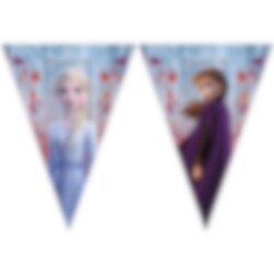 Fargerik flaggirlande av plast med vakkert motiv av søstrene Anna og Elsa fra Disneys film Frost 2. En imponerende dekorasjon til festen. Flaggirlanden er ca. 2,3 meter lang.