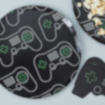 8 stk. sorte papptallerkener med et utrolig fancy motiv av diverse spillrelaterte ting fra Game On-kolleksjonen. Perfekt som borddekorasjon til festen med spill-tema. Tallerkenene er ca. 24 cm i diameter.