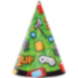8 stk. fine festhatter i grønt og svart med motiv av spillkonsoller og ikoner. En morsom ting å ha med til festen. Hattene er produsert av papir og er ca. 19 cm. høye. De settes på plass med et elastisk bånd.