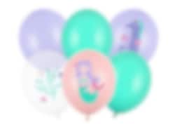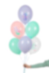 Vakker ballongbukett av høy kvalitet i fine farger med havfruemotiv. En nydelig dekorasjon å pynte rommet med når du skal ha en morsom fest med havfrueinspirert tema. Pakken inneholder 2 stk. ballonger i turkis farge, 2 stk. lys lilla ballonger med ballong som har motiv av en sjøhest, 1 stk. lyserosa ballong med motiver av en havfrue og 1 stk. gjennomsiktig ballong med motiv av en sjøblomst. Alle ballongene er ca 30 cm i diameter oppblåste og kan blåses opp med luft eller helium.