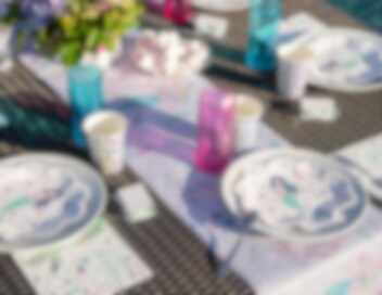 Lag en magisk borddekking til havfruefesten din med denne bordløperen som har motiver av store og små havfruer og andre sjørelaterte ting. Passer veldig fint sammen med vårt øvrige tilbehør i samme havfruetema som for eksempel tallerken, kopper og servietter. Bordløperen er i et polyestermateriale og er ca. 30 cm bred og 5 meter lang.
