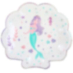 10 stk. skjellformede tallerkener i hvit farge med sølvfolierte kanter, og med motiver av en søt havfrue omgitt av fargerike planter og skjell. Perfekt å dekke bordet med til havfruefesten. Kombiner tallerkenene med kopper, servietter osv. fra samme tema for en nydelig look. Tallerkenene er ca. 22,7 x 21 cm store.