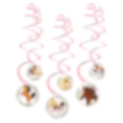 Hengende dekorasjoner i rosa og hvit med motiver av hester blant fargerike blomster. Flotte å dekorere med til neste fest med hestetema. Pakken inneholder 6 stk. dekorasjoner som er ca. 60 cm lange, og med motiver som er ca. 13 cm i diameter.