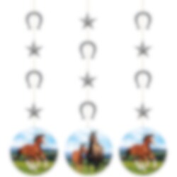 3 stk. hengende dekorasjoner med motiv av stjerner, hestesko og søte hester. Dekorer festrommet med disse for å få det lille ekstra til hestefesten. Dekorasjonene er ca. 91 cm lange og motivet med hestene er ca. 18 cm i diameter.
