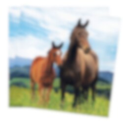 16 stk. servietter med søtt motiv av en hest sammen med sitt føll ute på en eng. Serviettene er 2-lags og er ca. 33 x 33 cm store utfoldet.