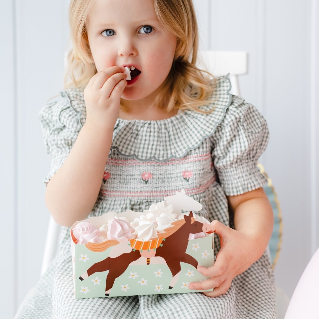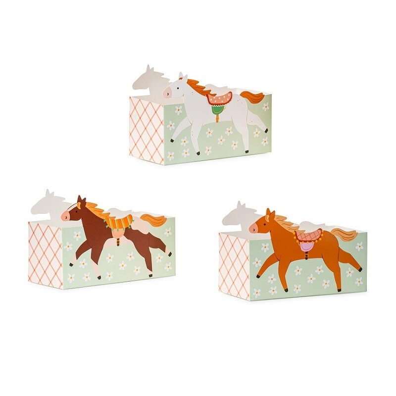 Gjør bursdagen enda mer spennende med disse søte snacksboksene i hestetema. Hver pakke inneholder tre bokser i tre forskjellige modeller, perfekte for å servere snacks, godteri eller små overraskelser til dine gjester. Størrelsen på boksene er 17 x 11 x 7,5 cm. Laget av papp.