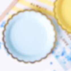 6 stk. pappasjetter med lyseblå bakgrunn og gullfolierte kanter. Flotte å dekke på med til babyshower eller bursdagsfeiring. Asjettene er ca. 18 cm i diameter.